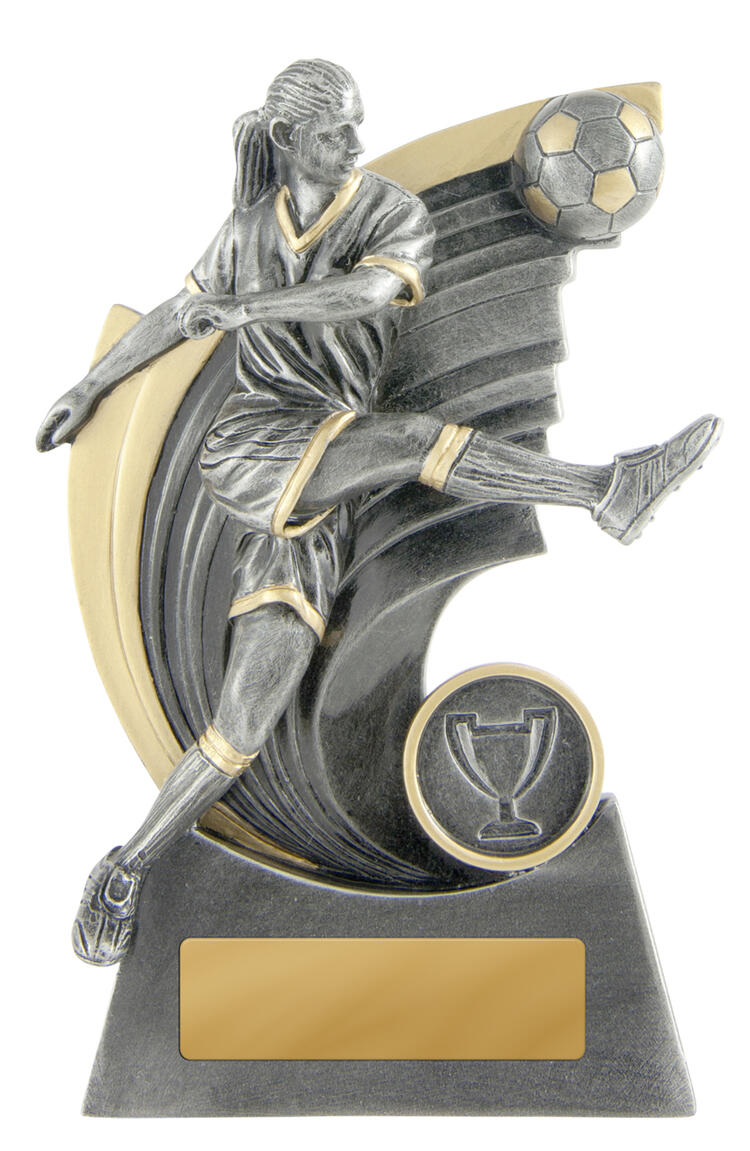 Crafted for standout recognition in women's football, this gold finished soccer trophy features a dynamic female player in motion atop a solid rectangular base. The design is highlighted by a football and trophy emblem, incorporating a striking lightning bolt motif for added impact.