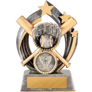 A refined choice for recognising excellence, this baseball trophy or softball trophy showcases a striking gold and silver palette. Crafted from resin, it features a circular base with crossed bats, a baseball glove and golden ball surrounded by stars, and a distinguished trophy emblem.
