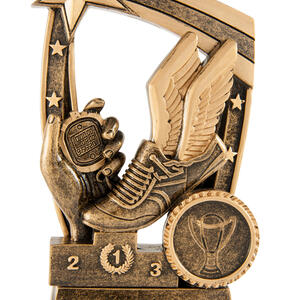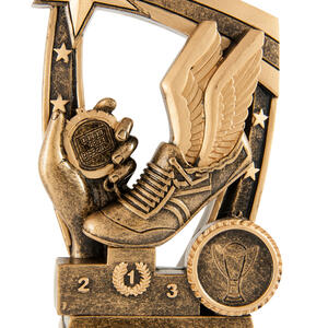 Celebrate speed and achievement with this resin trophy, designed for standout athletics awards. Featuring a winged running shoe, stopwatch, and medal set against a border of victorious figures and stars, it recognises excellence in track and field.