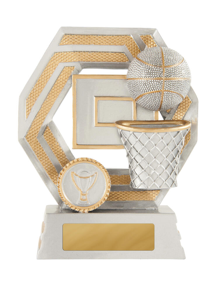 The Titan Series Basketball Trophy stands out with its striking two tone silver and gold finish, crafted from resin for lasting quality. Ideal for basketball awards, this substantial trophy is designed to honour standout achievements on the court.