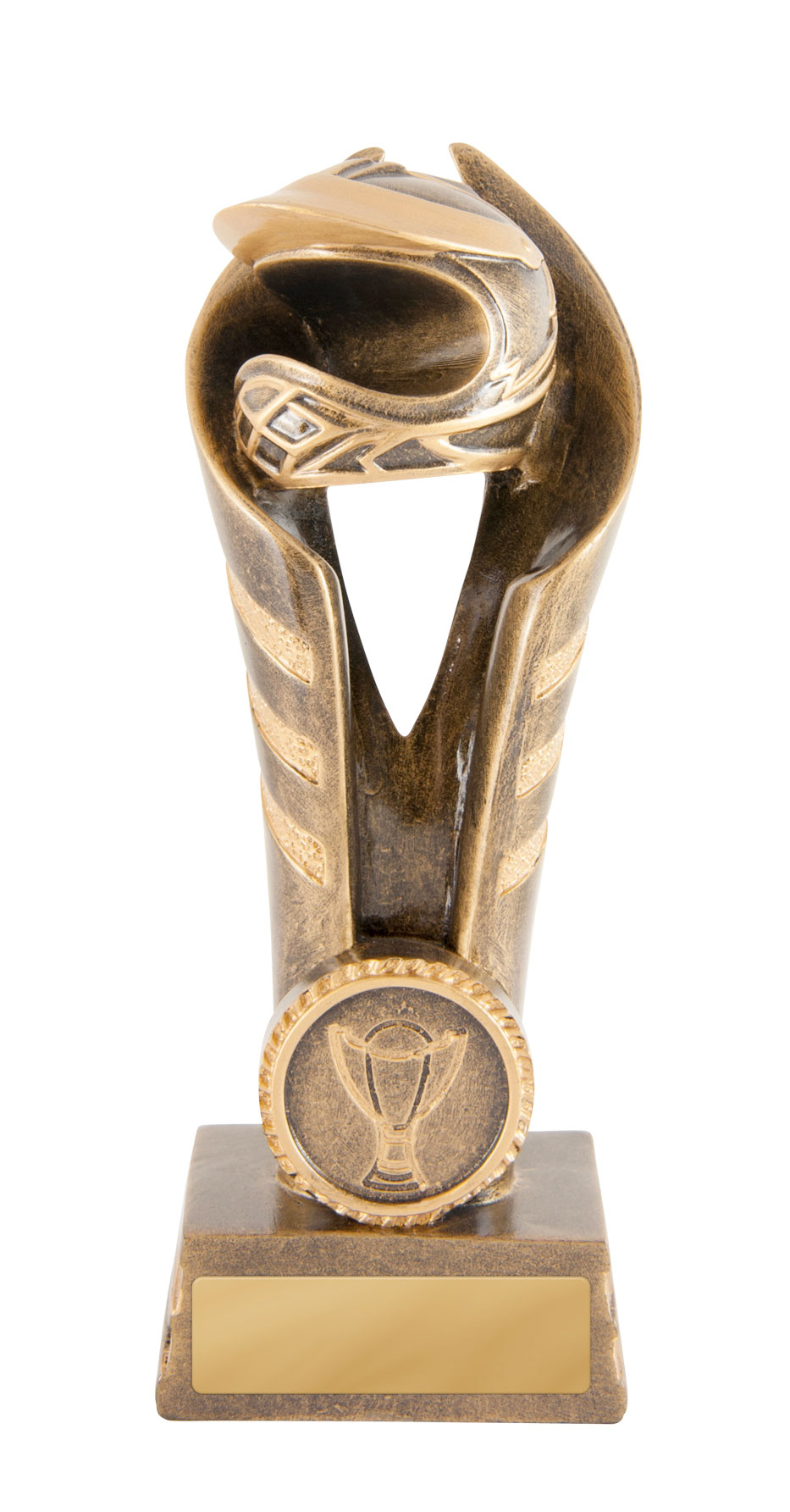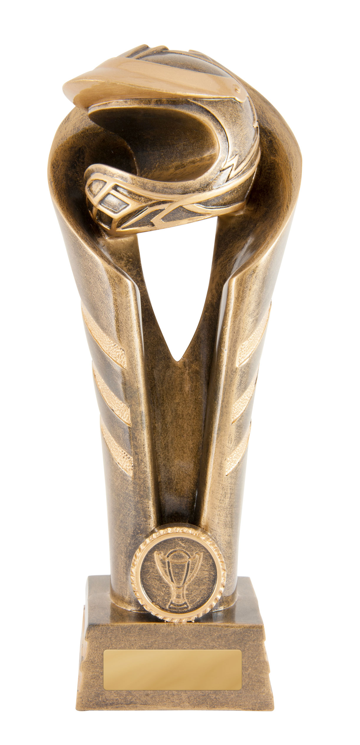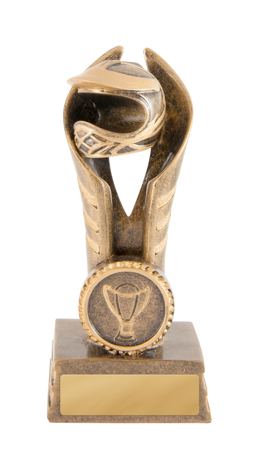 Showcasing a distinctive helmet design, this motor sports trophy blends contemporary elegance with a nod to sporting tradition. Crafted in resin, it features a trophy emblem at the base for added significance. Suitable for club events, it offers a memorable way to recognise achievement and celebrate commitment to the sport.