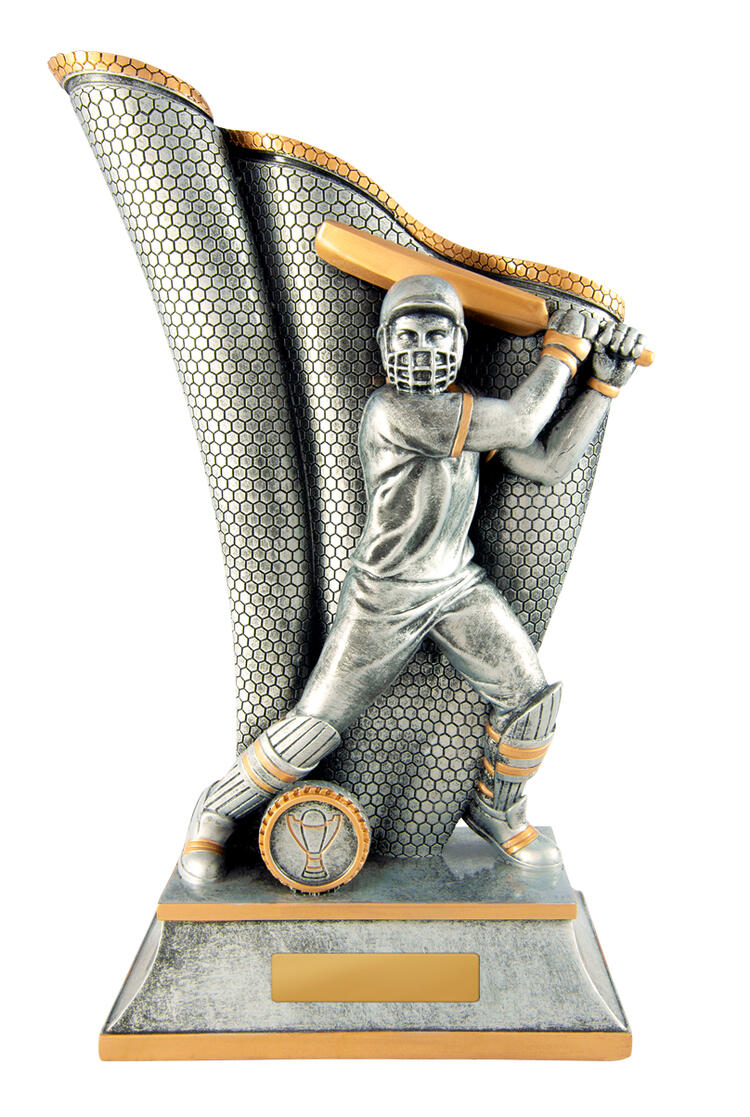 This cricket trophy from the Wave Series features a striking male batsman in full action, with intricate detailing in the bat and protective gear. Finished in antique silver and gold resin, it offers a professional and memorable way to honour sporting achievement.