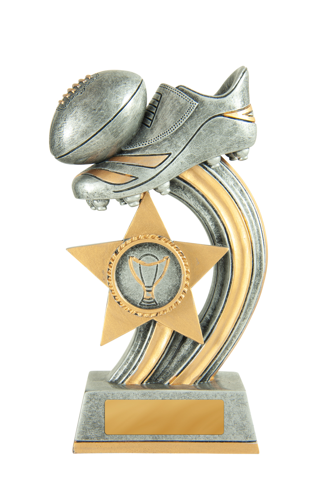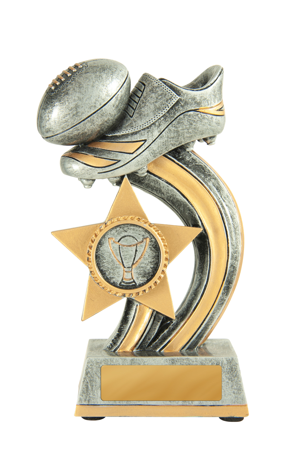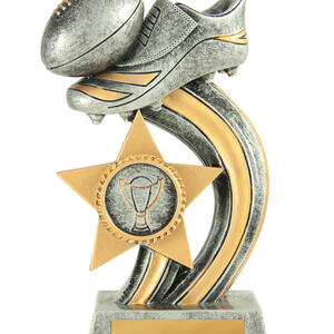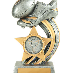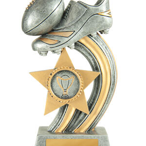 This afl trophy pairs classic sporting imagery with a contemporary, star inspired design. Crafted in durable resin with an antique silver and gold finish, it features a striking footy boot and ball on a curved base.