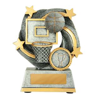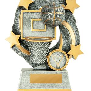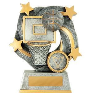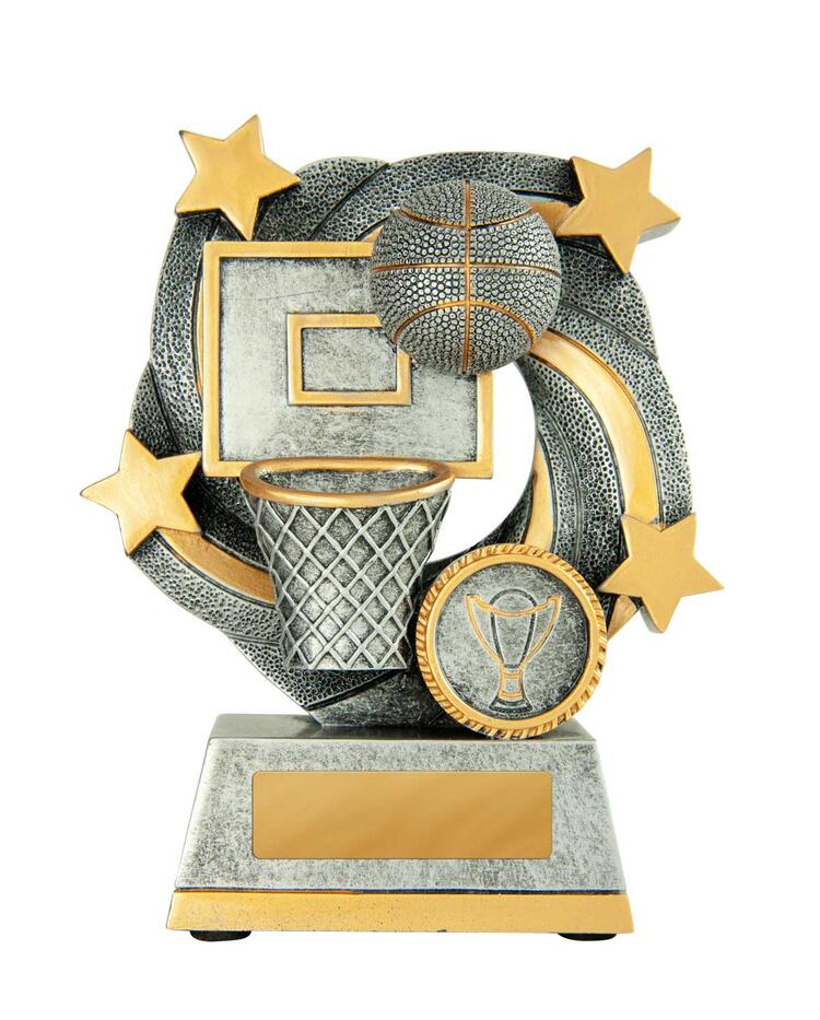 Celebrate success on the court with this striking basketball trophy, expertly crafted in durable resin. Distinguished by its bold basketball, hoop, and star motif, it offers a refined finish in your choice of gold, silver, or grey.