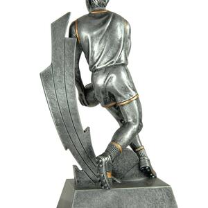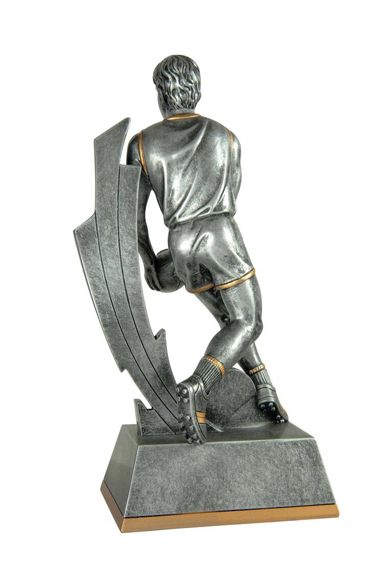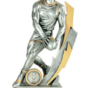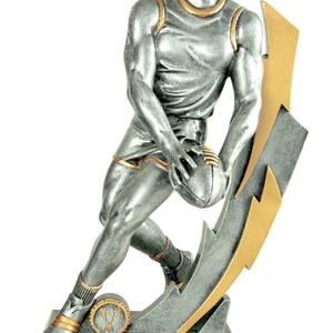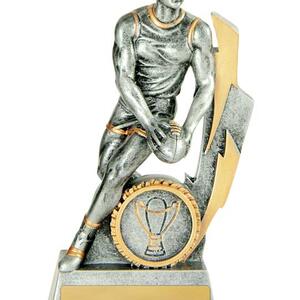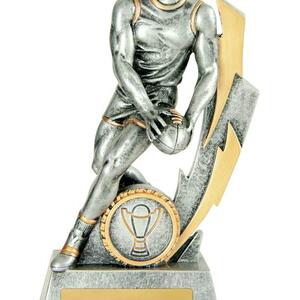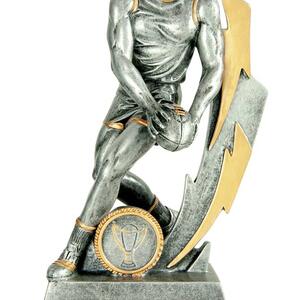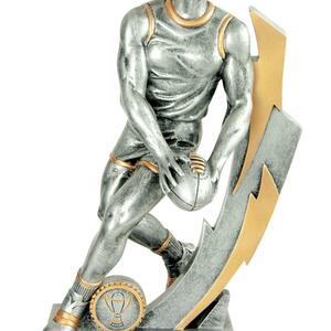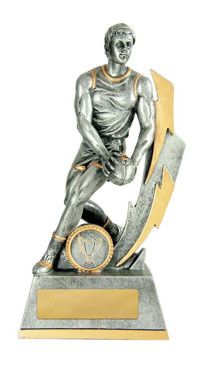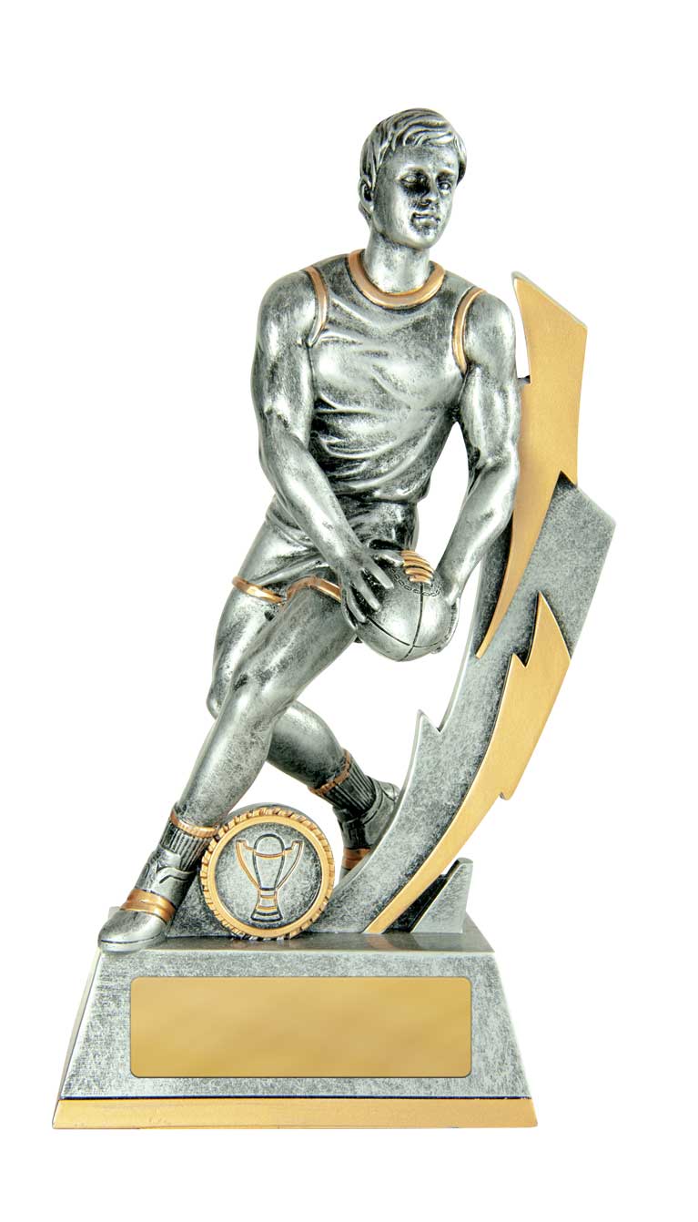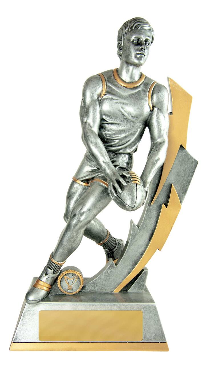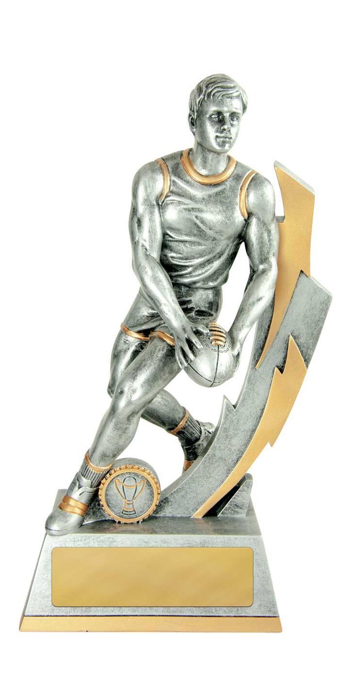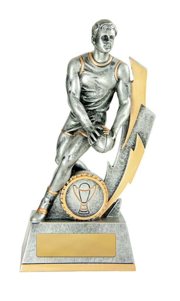 Crafted to honour outstanding play in Aussie Rules Football, this elegant afl trophy features a male figure holding a ball, set against a dynamic lightning bolt backdrop. The antique silver-gold resin finish gives it a distinguished, durable presence.