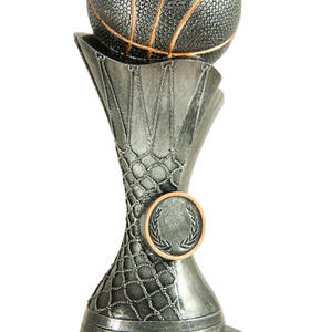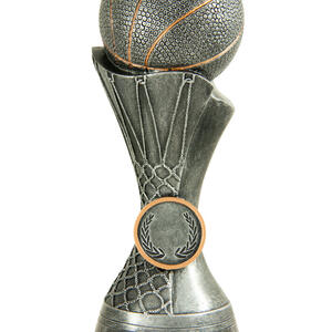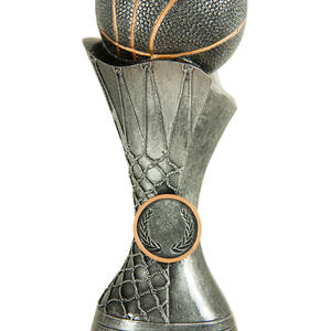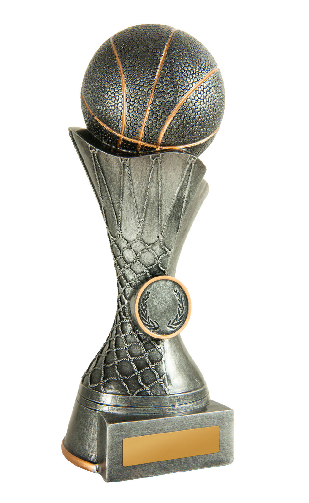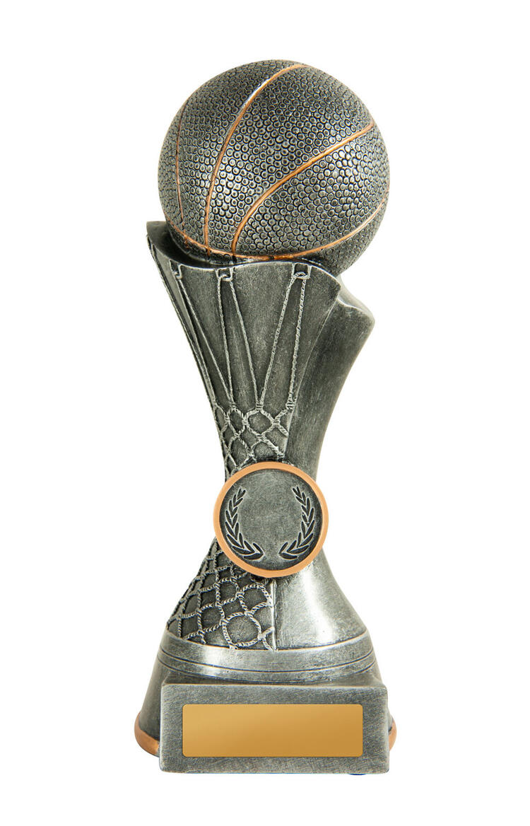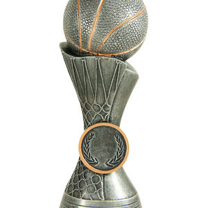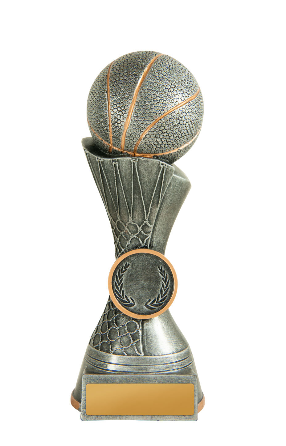 Antique silver resin basketball trophy with a sculpted ball and textured base design. The laurel emblem adds a touch of tradition, making it perfect for recognising standout players and achievements.