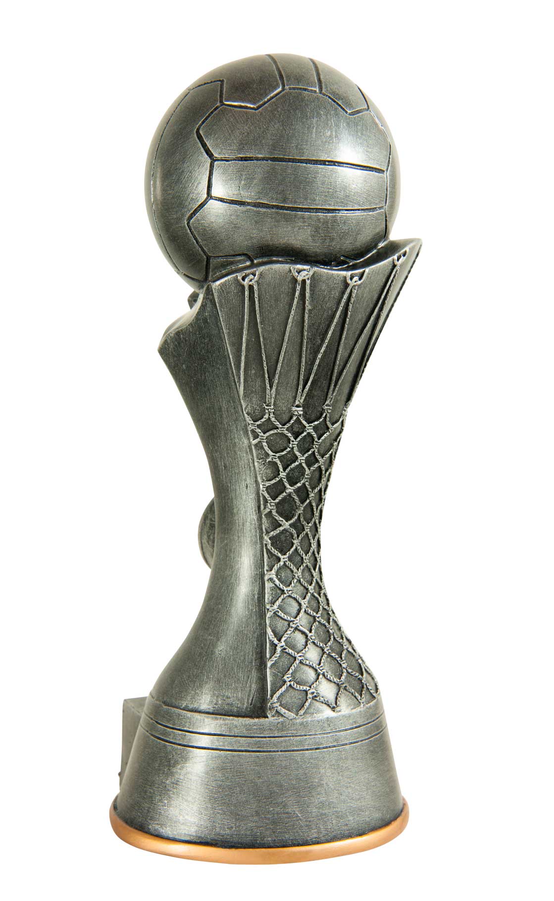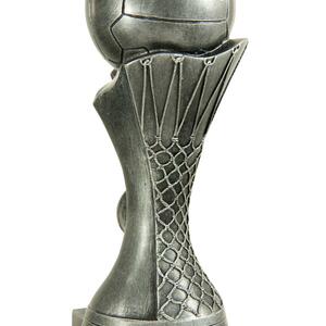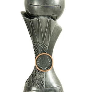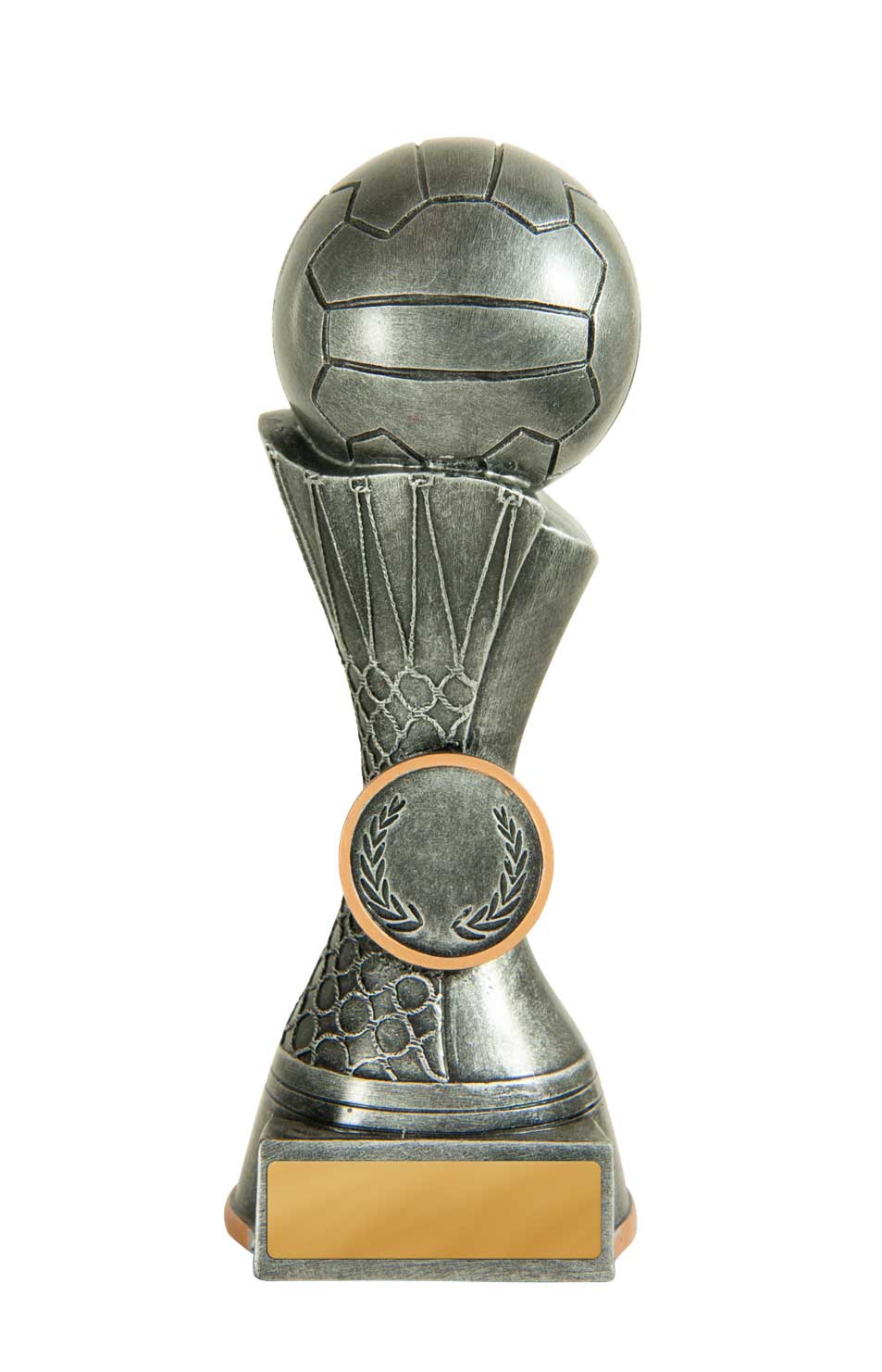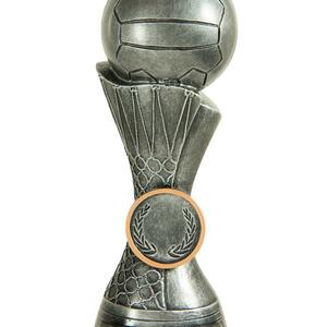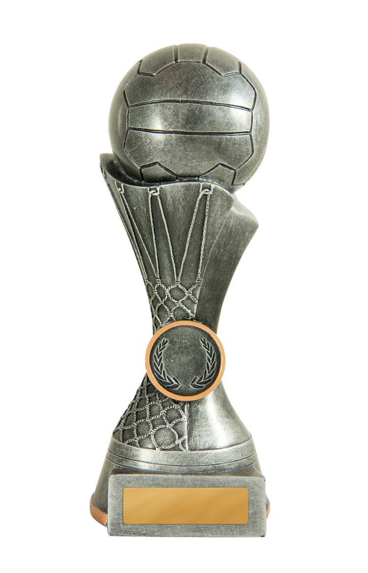 This contemporary netball trophy combines a striking silver finish with refined gold accents, making it a standout choice among netball trophies. A spherical top resembling a netball crowns the design, complemented by a laurel wreath motif and a flared base.