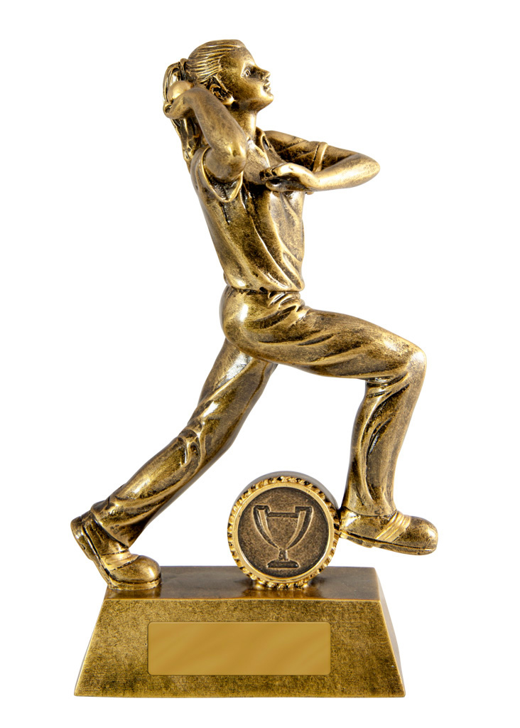 Celebrate performance on the cricket pitch with this elegant bowler trophy, crafted to recognise the skill and commitment of female bowlers. Featuring a dynamic figurine in a powerful bowling pose, this gold finished award showcases the artistry of cricket trophies.