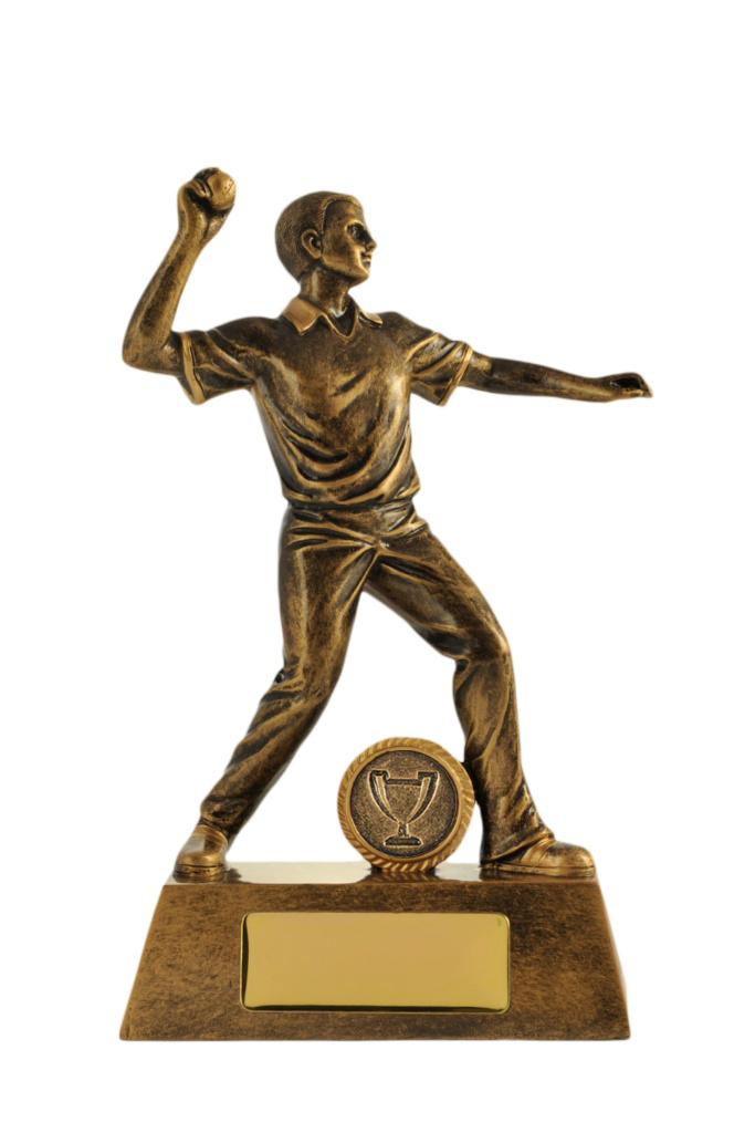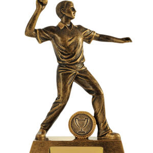 This cricket trophy features a dynamic bowler captured mid action, finished in gold with antique bronze highlights for a refined, professional look. Crafted from resin and mounted on a sturdy base, it includes a blank plaque for custom engraving. This cricket fielder trophy is crafted to recognise standout fielding or bowling achievements with distinction.