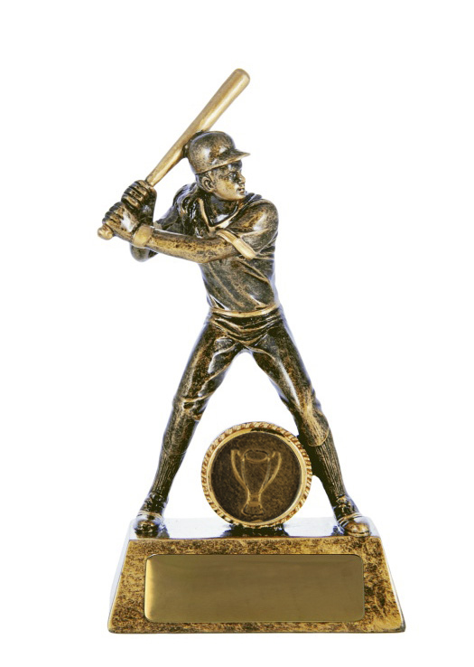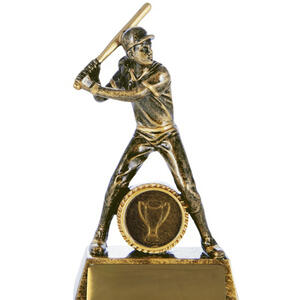 Celebrate dedication on the diamond with this elegant baseball trophy or softball trophy. Crafted in gold and brown, it features a dynamic figurine of a batter poised for action atop a sturdy rectangular base. The resin construction ensures durability, while a blank plaque allow for personalised recognition of sporting achievement.