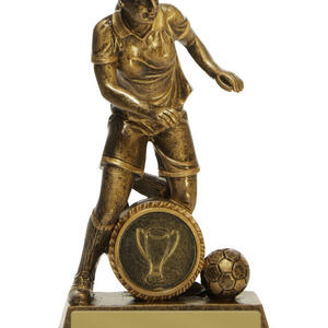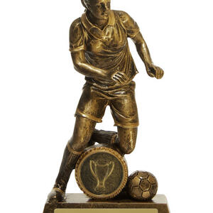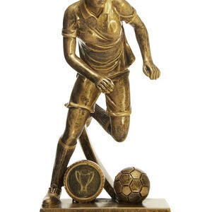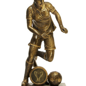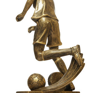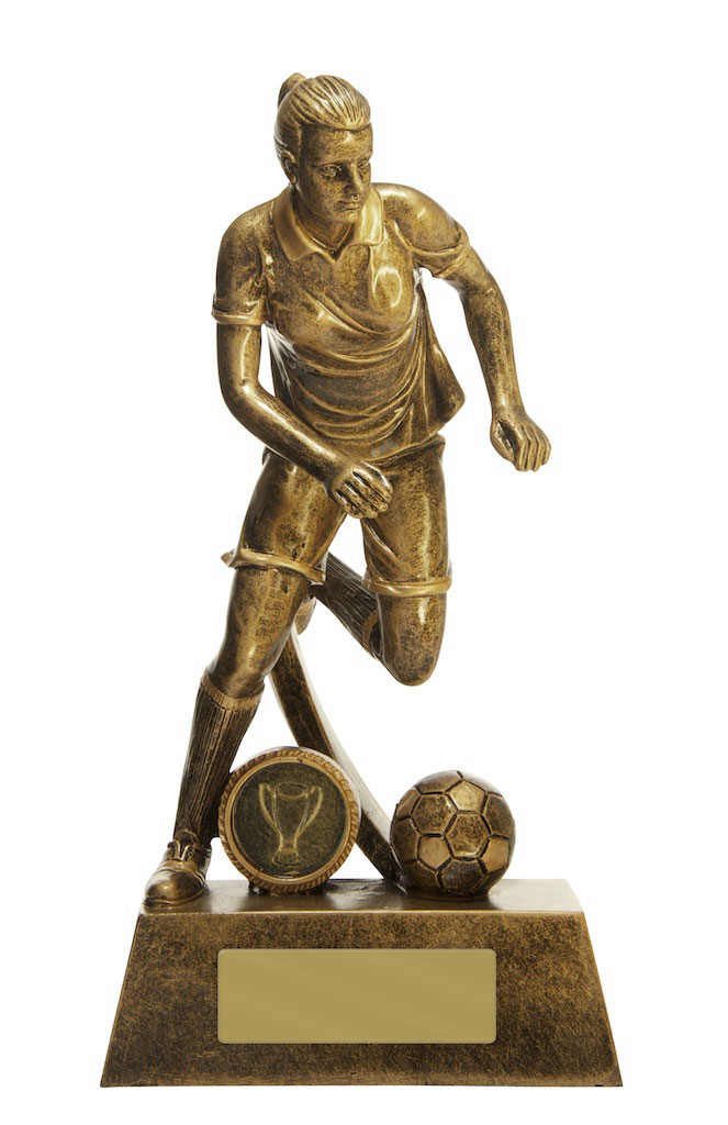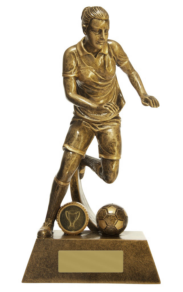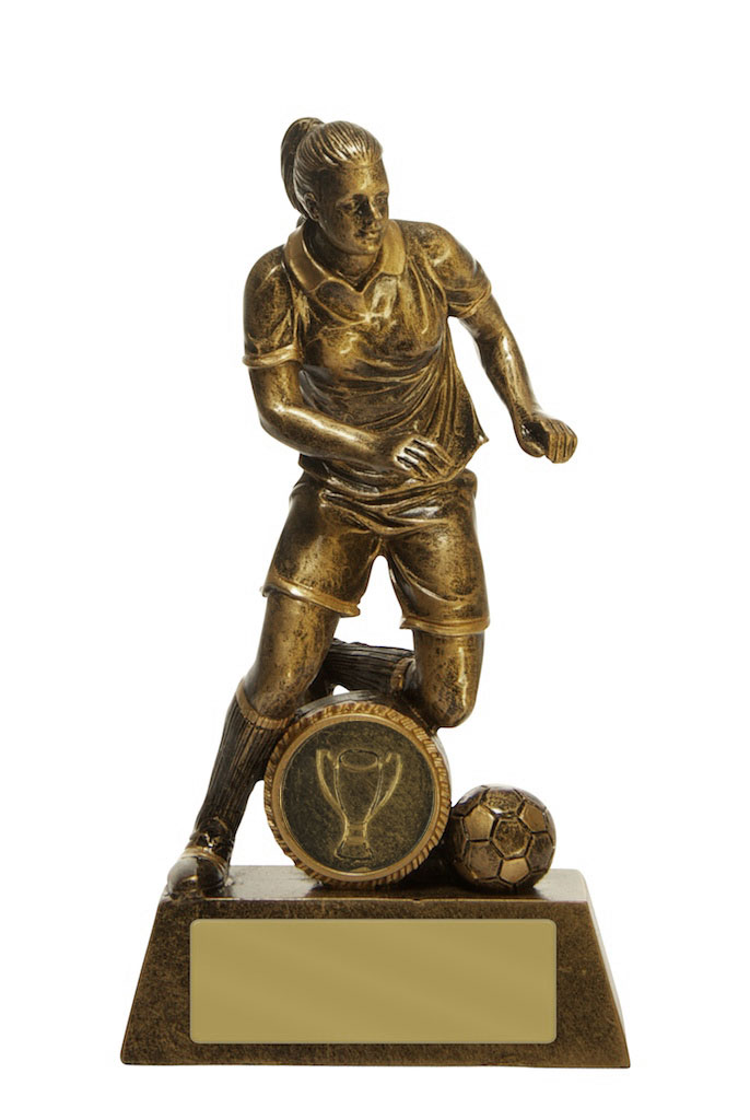 Crafted for standout recognition in women's football, this gold finished soccer trophy features a dynamic female player in motion atop a solid rectangular base. The design is highlighted by a football and trophy emblem, incorporating a striking lightning bolt motif for added impact.