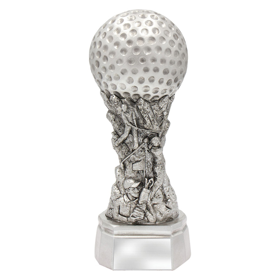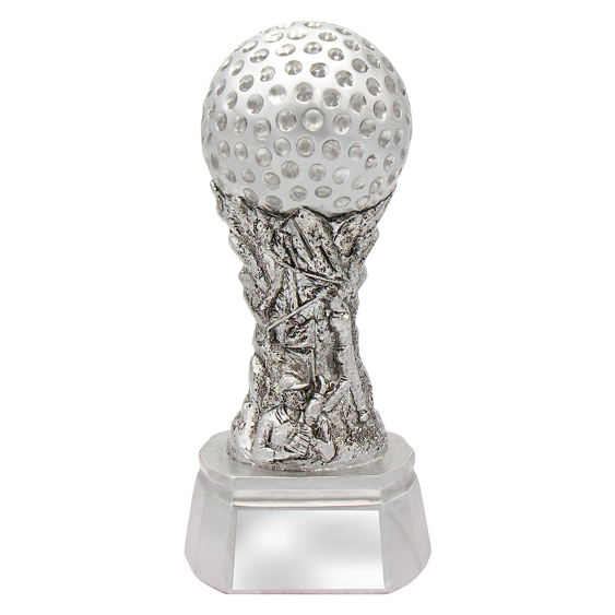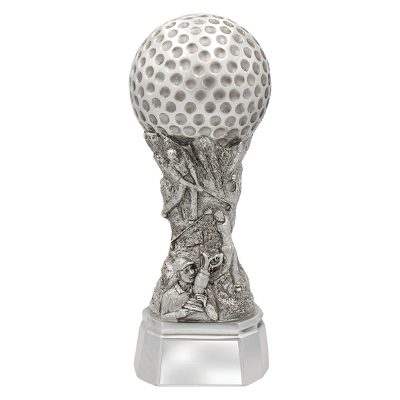 The Golf Tradition Trophy highlights golfer figures and an elevated 3D ball in a classic antique silver finish-timeless and versatile.