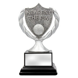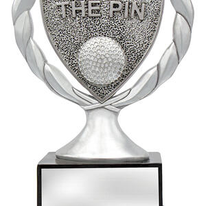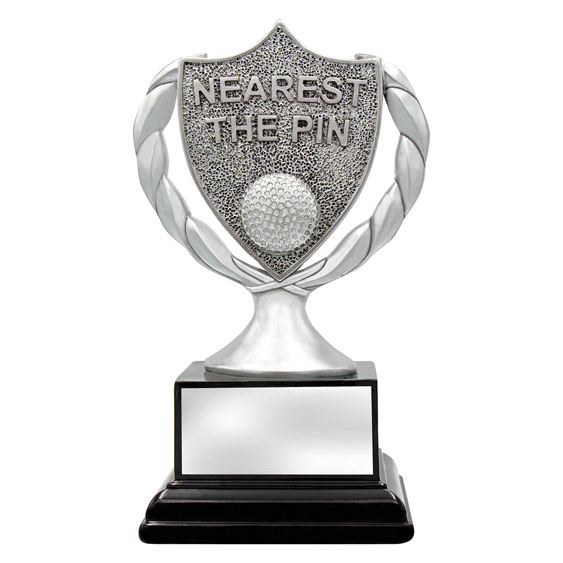 The Nearest the Pin Golf Trophy uses a wreath?inspired antique silver shield to recognise precision and accuracy on the green.