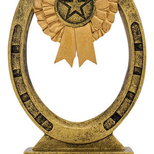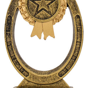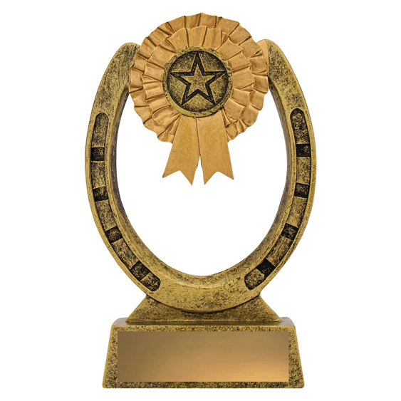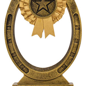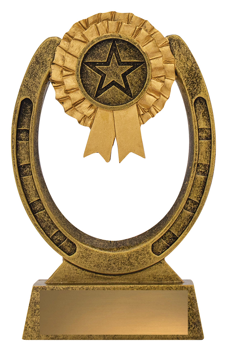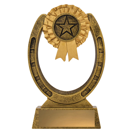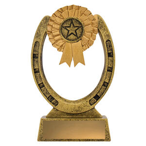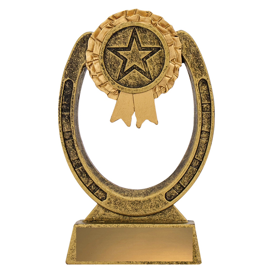 This award combines the timeless symbols of equestrian success - a detailed horseshoe with a rosette and star emblem at the centre. Cast in antique gold resin with textured detailing, itÂ’s an excellent choice for general horse awards, stable competitions, participation trophies or special recognition. The open horseshoe design gives it a light, stylish appearance.