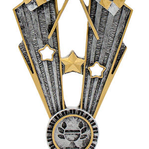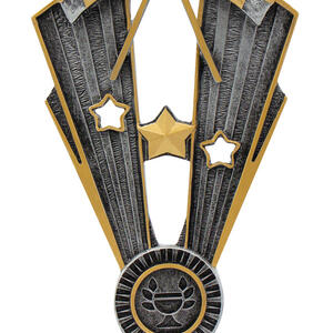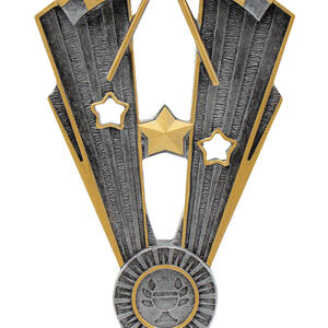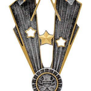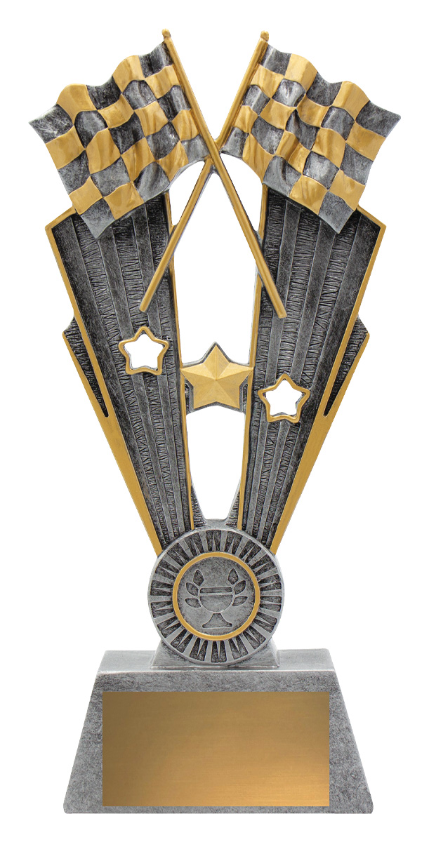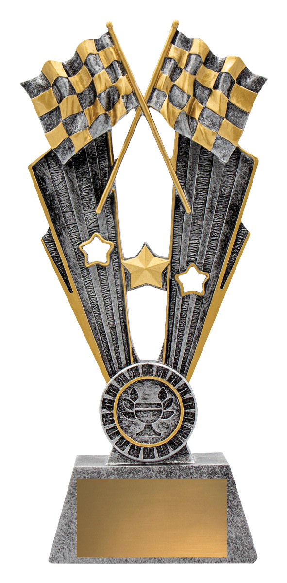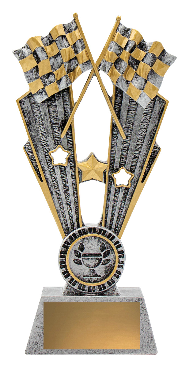 Showcasing bold gold and silver tones, this motorsport trophy features a dynamic pairing of crossed chequered flags, a striking star motif, and a circular emblem with a trophy design. Crafted from quality resin, its decorative elements and rectangular base create a memorable tribute for motorsport achievements. Ideal for those seeking premium motorsport trophies with lasting appeal.