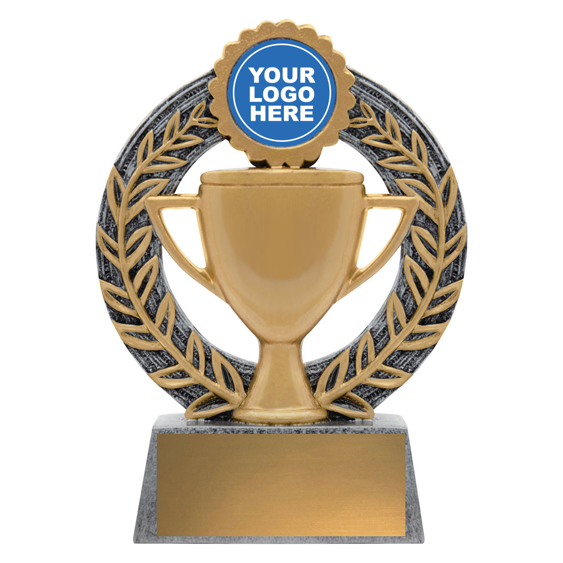 This classic trophy features a gold cup surrounded by a laurel wreath and custom logo insert area. A versatile and affordable option for any type of achievement or participation award.