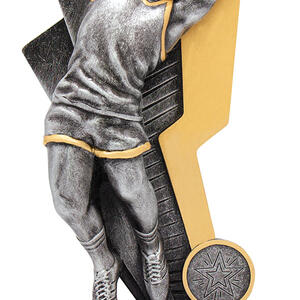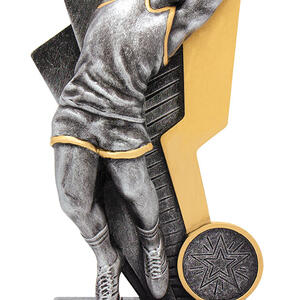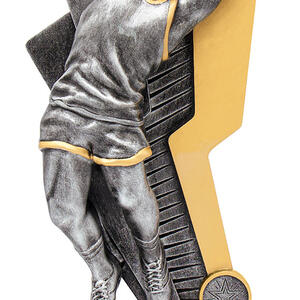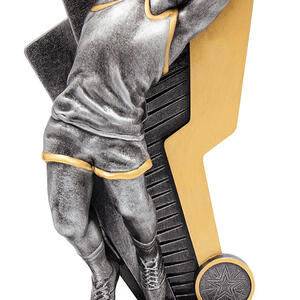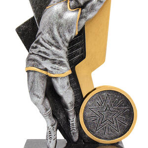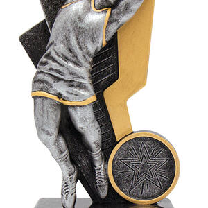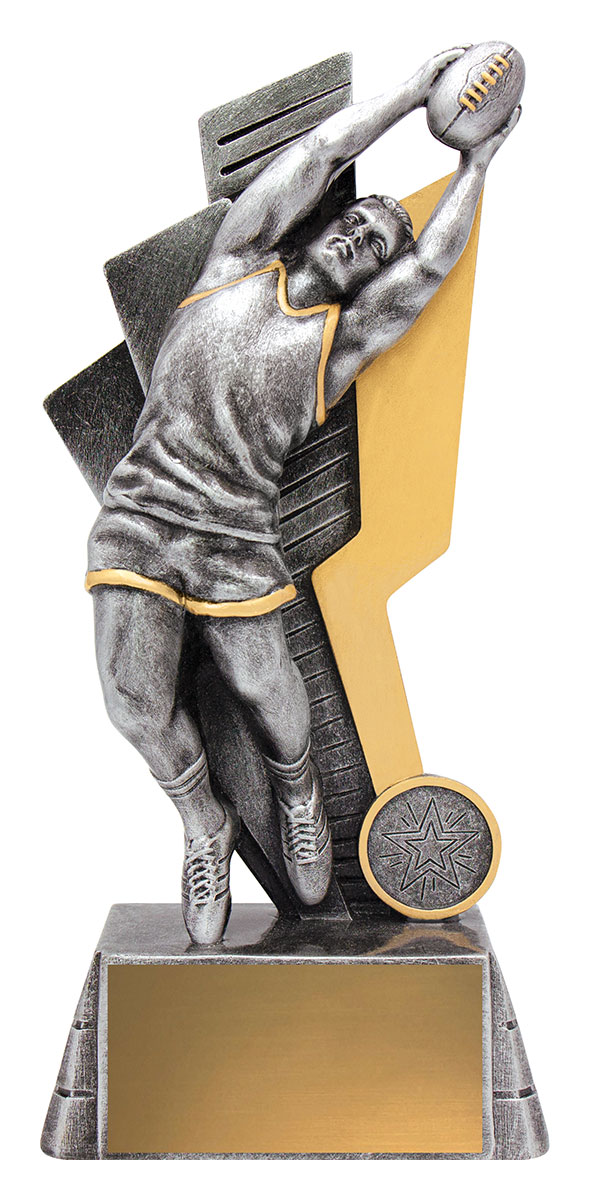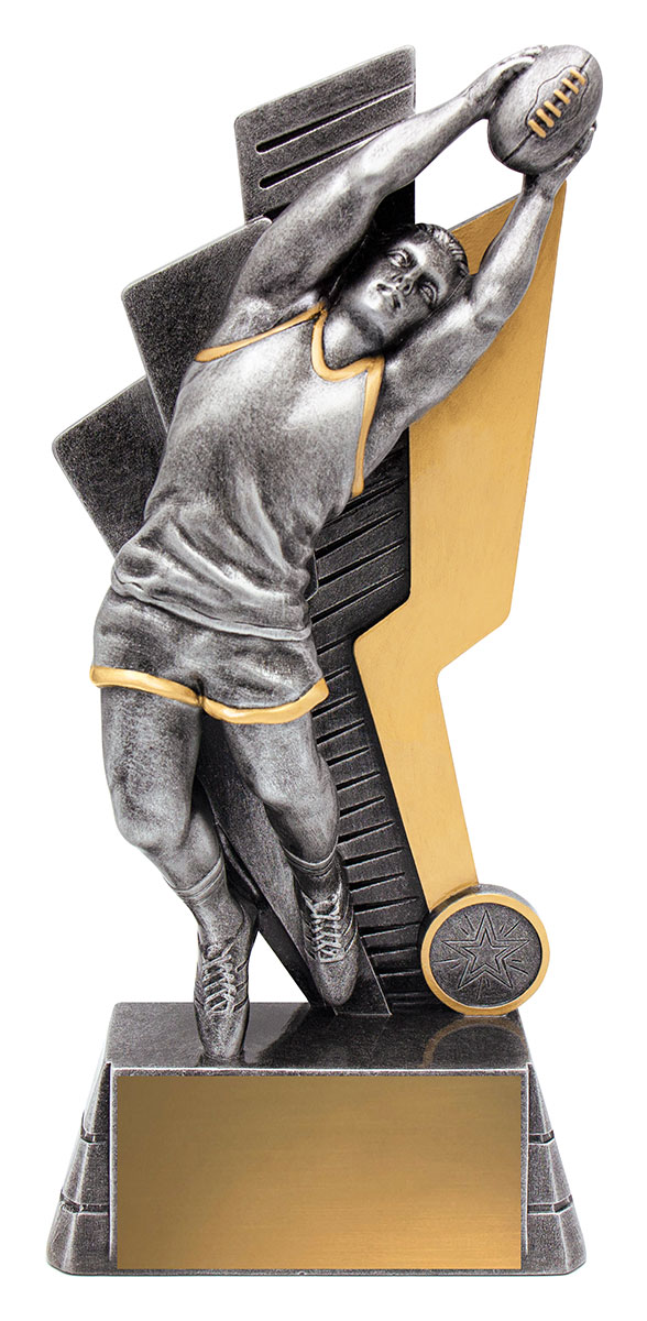 This aussie rules trophy captures the spirit of the game with a striking male figure catching a football, set atop a sleek rectangular base. Available in refined silver and gold finishes, its metal and resin construction ensures durability and a lasting impression.