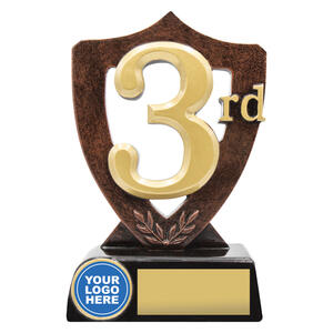 This shield shaped award stands out with its elegant gold and black finish, crafted for general achievement recognition. The sturdy rectangular base supports a bold shield design, highlighted by a prominent gold '3rd' and a circular area ready for your logo. Durable resin and a classic profile make it a trusted choice for lasting recognition.