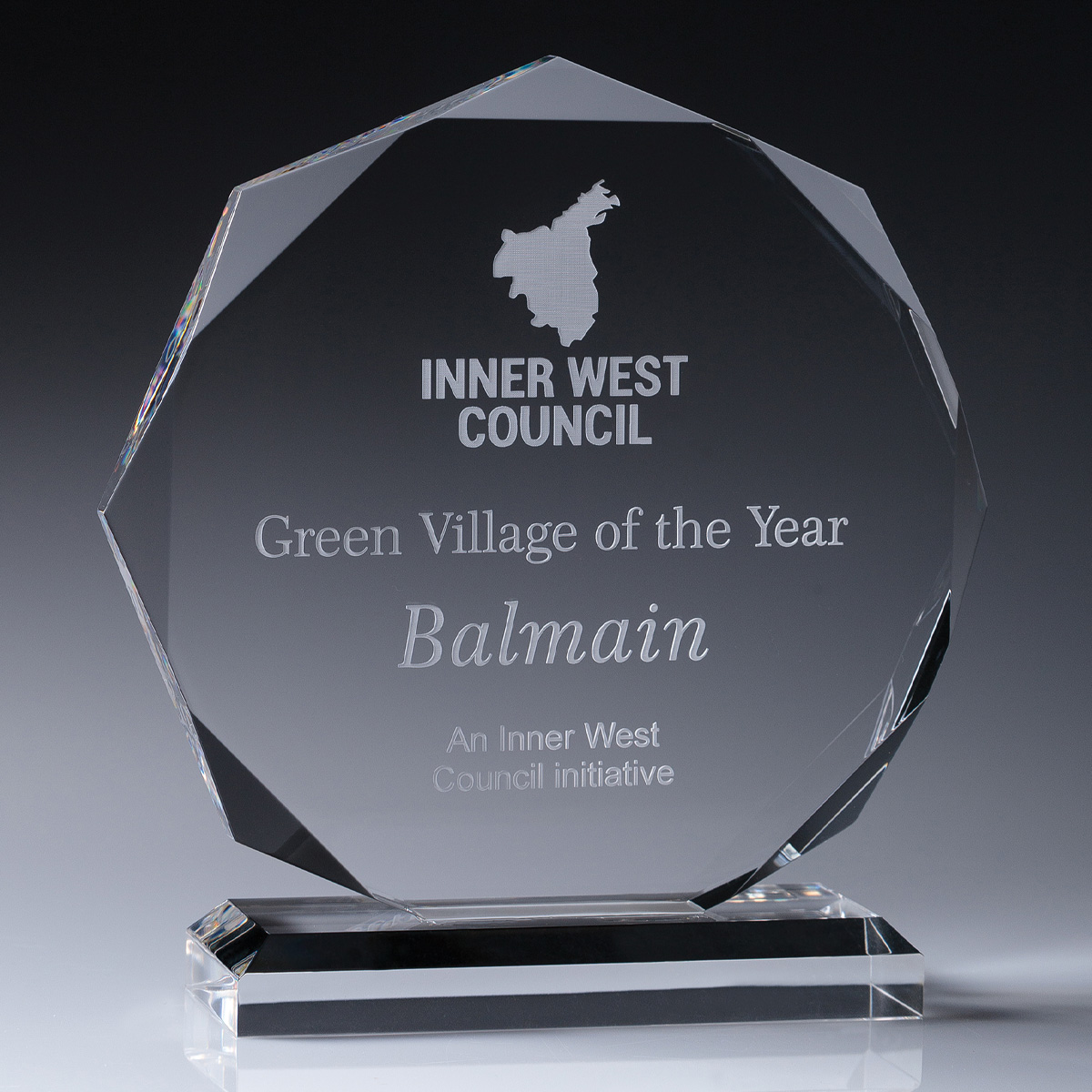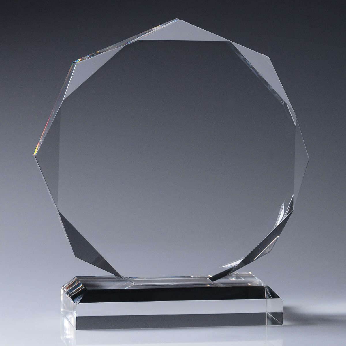 This elegant octagonal acrylic award offers clean syetry and modern appeal. The polished multi-faceted edges enhance light reflection, giving a crystal like brilliance that complements any event or recognition ceremony.