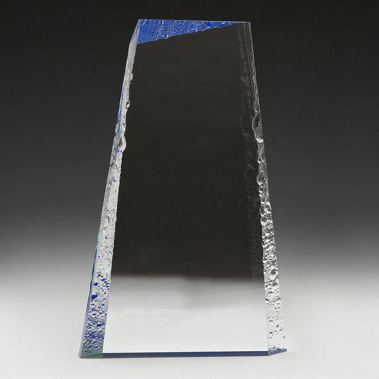 This acrylic award features a striking clear and blue palette, elegantly shaped into a tapered rectangular prism. Crafted from acrylic, it showcases a textured side design that adds a refined visual dimension. The engraved text and contemporary form make it a memorable choice for recognising achievement in any professional or celebratory setting.