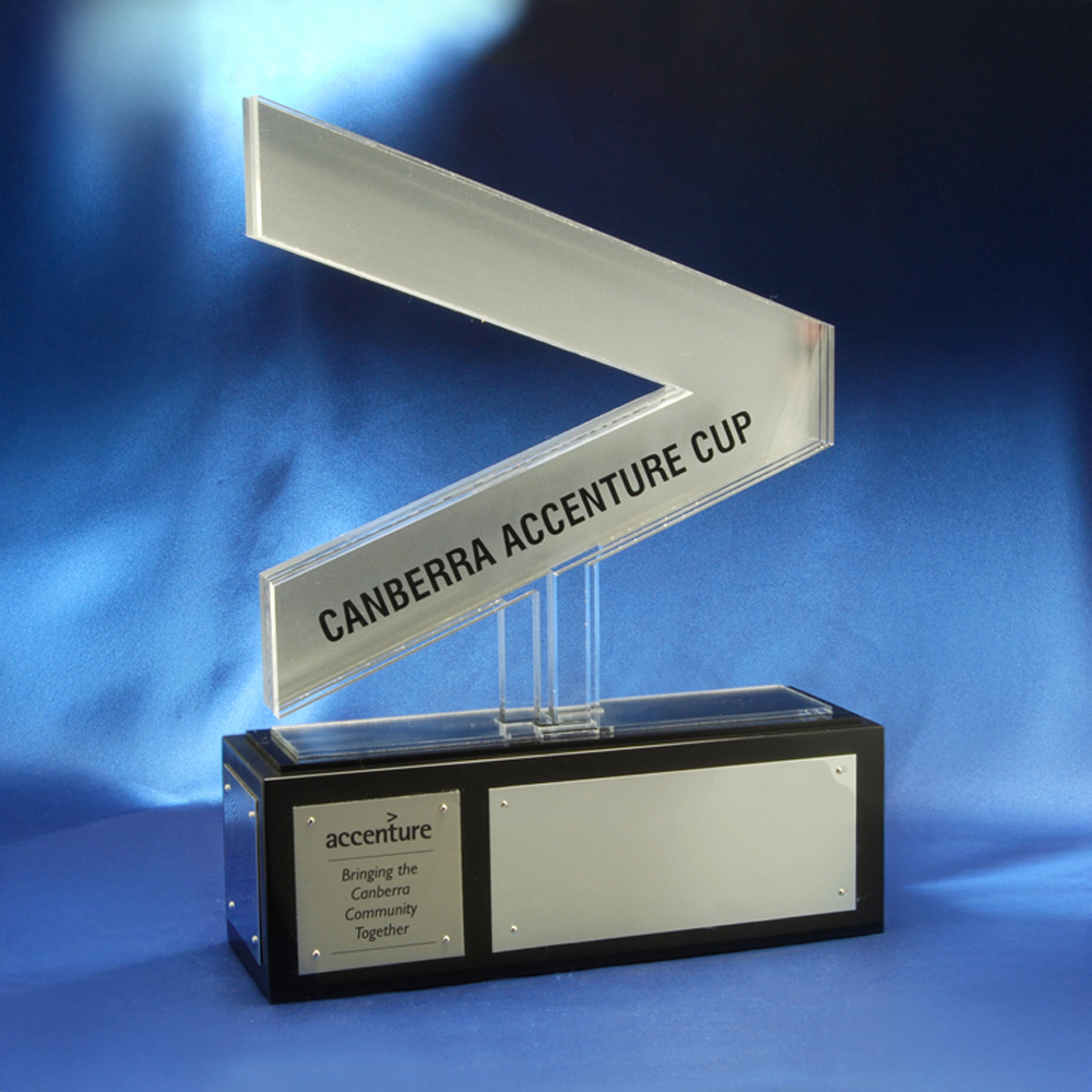 Modern acrylic perpetual trophy with angular cut out and polished metal panels on a solid base.