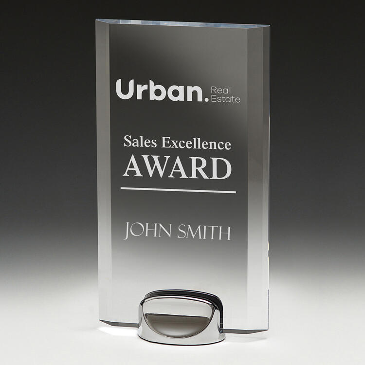 This graceful acrylic trophy features a rounded top and sturdy freestanding design. Its clear finish and modern base make it an ideal option for sales excellence and professional recognition.