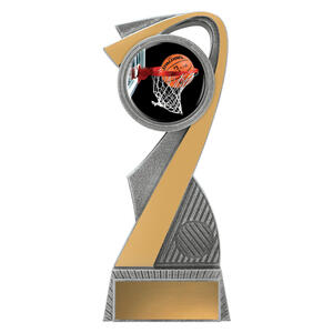 Stylish silver and gold resin basketball trophy featuring a bold circular frame design with detailed basketball and hoop artwork. Made from quality solid resin and designed to include a custom club logo insert on the base. A versatile choice for recognising individual or team achievement at any level of competition.