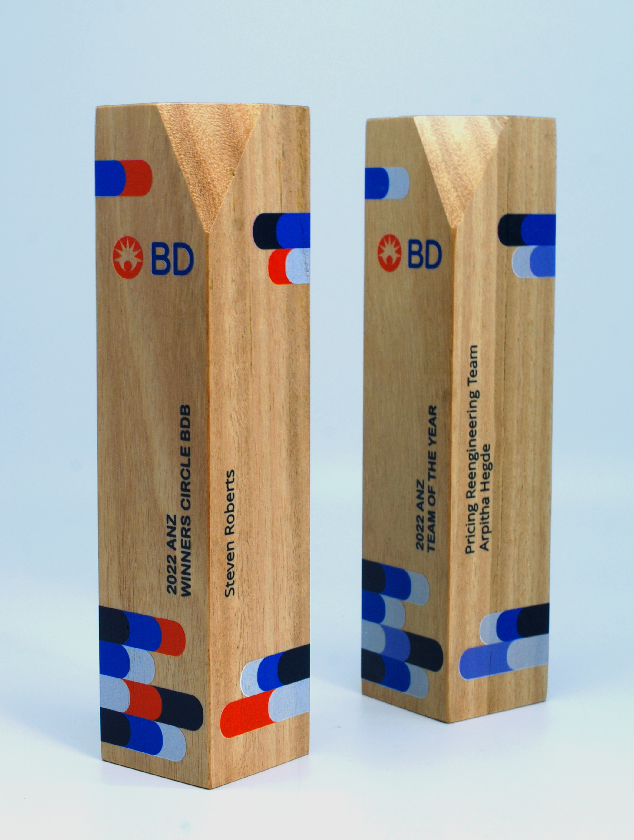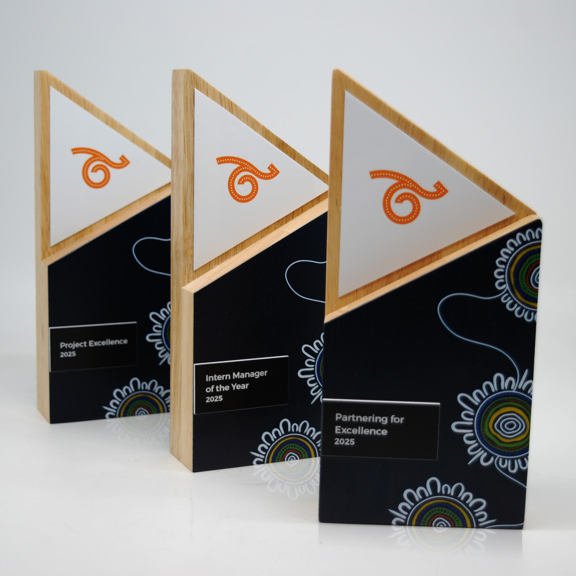 Custom timber awards bring warmth and authenticity to your recognition program. Each piece is made from sustainably sourced Australian timbers and finished to highlight the wood's natural grain and tone. From minimalist contemporary designs to heritage-inspired plaques, our team can craft a one-of-a-kind timber award that captures your story with depth and character.