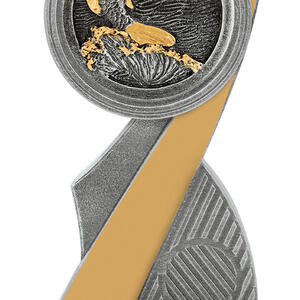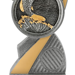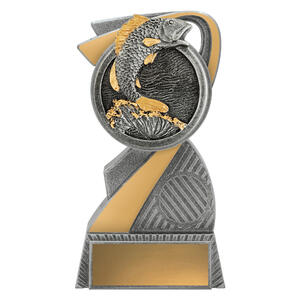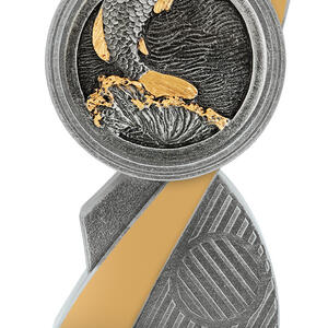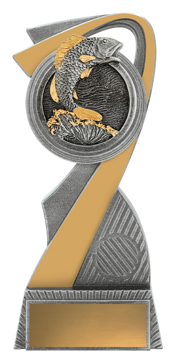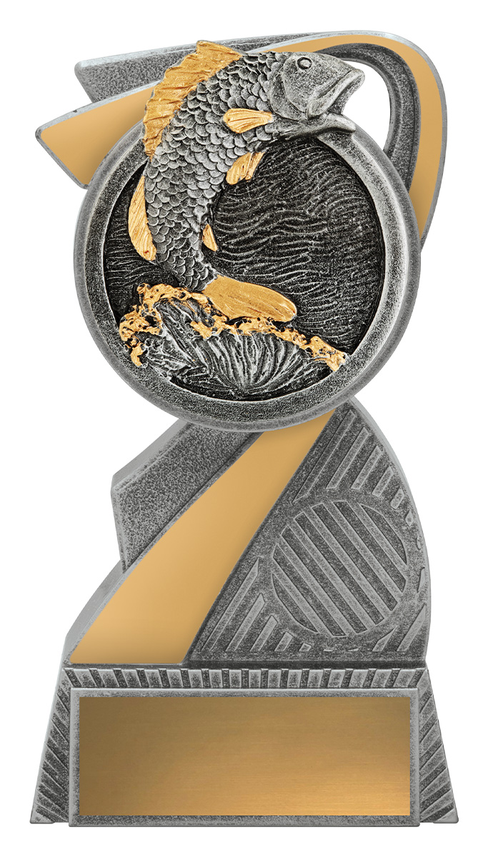 This modern resin fishing trophy showcases a fish leaping from the water in stunning detail. With its swirling gold and silver base, itÂ’s an elegant choice for individual or club awards celebrating top fishing achievements.