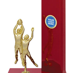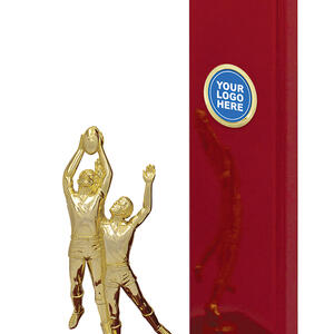 This gloss red timber trophy celebrates the spirit of Aussie Rules with its sculpted wing shaped back and polished rectangular base. A gold metal figurine of two players in contest underscores the energy of the sport, framed by rich red and gold tones.