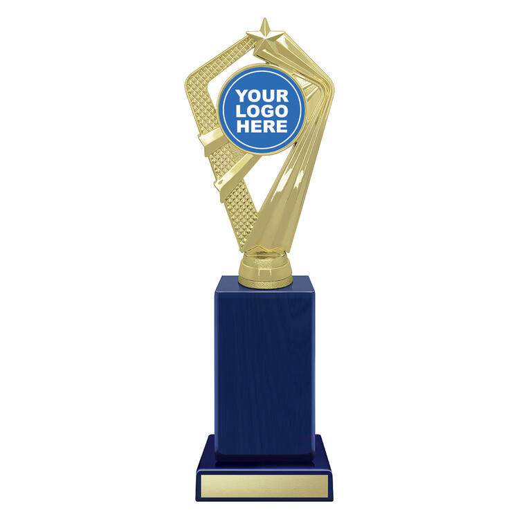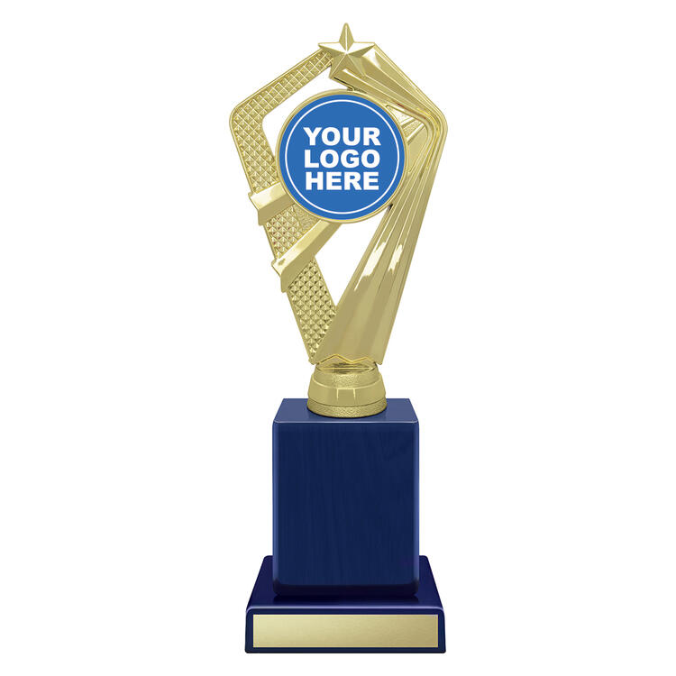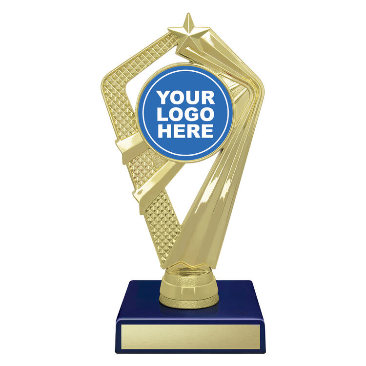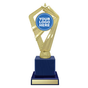 This gold plastic trophy features a striking star-inspired design mounted on a solid black base. Lightweight and stylish, itÂ’s perfect for any sport or event and includes space for your custom or standard logo centre.