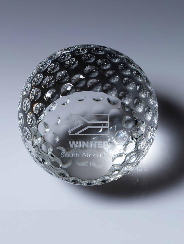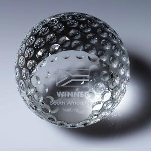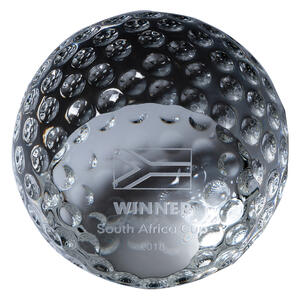 This elegant golf trophy paperweight is crafted from clear crystal in a refined spherical shape. Its textured surface authentically resembles a golf ball, complemented by our precise sandblast enrgaving. A professional and memorable award, it recognises achievement in golf with lasting style and serves as a distinguished addition to any workspace or display.