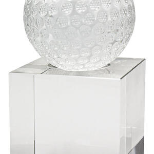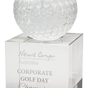 This crystal golf trophy features a clear cubic base crowned by a finely crafted spherical top, capturing the essence of the sport with a distinctive golf ball design. Its crisp lines and transparent finish create an elegant, contemporary look that stands out on any display. An ideal choice for recognising excellence and achievement in golf.