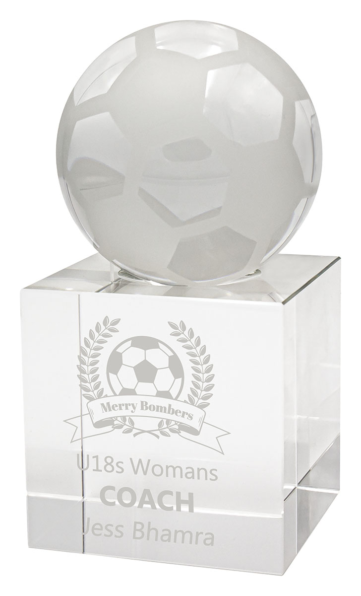 A striking choice for football recognition, this crystal trophy features a clear cuboid base crowned with a frosted white spinning football. The contemporary design and refined materials make it an ideal football league trophy, offering a lasting symbol of achievement and professionalism.