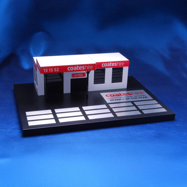 The design includes angled metal fins mounted on a sleek black base with silver name plates, offering an enduring and professional way to honour ongoing achievement or annual recognition.