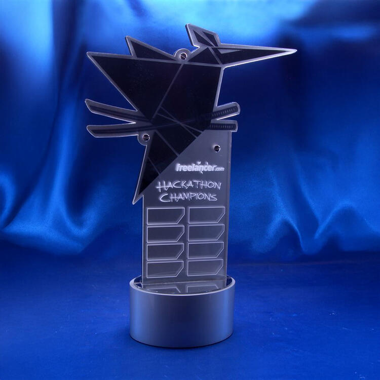 Creative perpetual award featuring a custom cut acrylic figure mounted above a tiered name plate base.