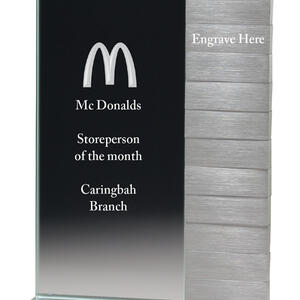 This elegant perpetual award is crafted from premium glass with a brushed metal side panel featuring removable plates, perfect for updating with winners' details each year. The glass front is sandblasted with your custom design or logo, making it an ideal recognition piece for ongoing achievements. Stylish and versatile, it offers a lasting way to celebrate excellence over time.