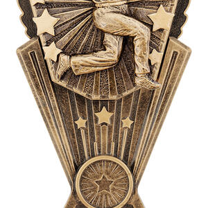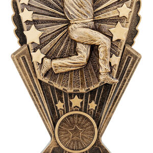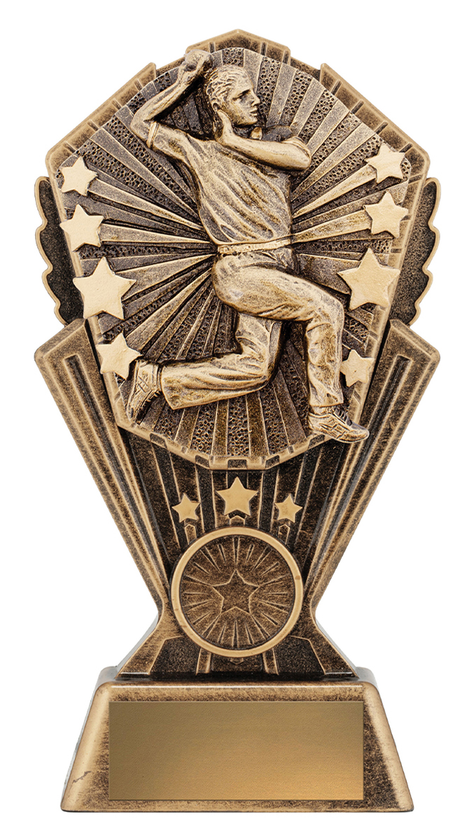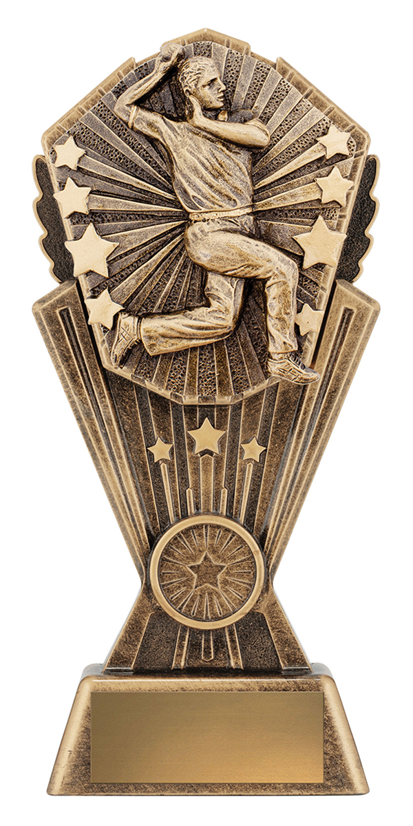Celebrate cricketing excellence with this expertly crafted trophy, designed to honour standout bowling performances. Featuring a dynamic male cricketer in mid action, the gold tones complement a striking starburst motif and star details. Ideal for cricket trophies presentations, its durable materials and professional finish make it a memorable choice for recognising achievement.