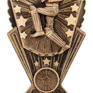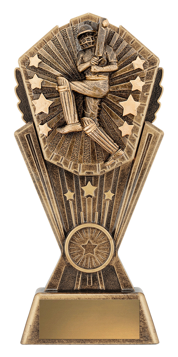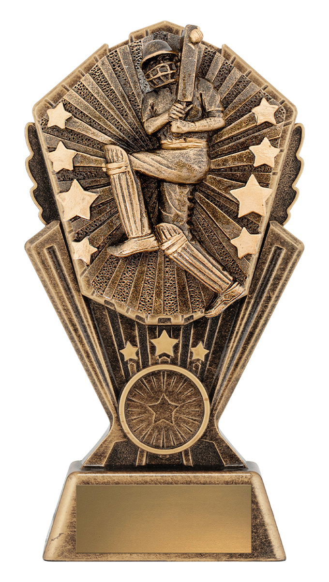 Celebrate cricketing achievement with this elegantly crafted trophy, designed for those who value quality and distinction. Featuring a cricket player in action, the gold design incorporates a dynamic starburst pattern and stars that evoke a true sense of accomplishment. The sturdy resin construction, paired with a decorative base, makes it an exceptional choice for cricket trophies.