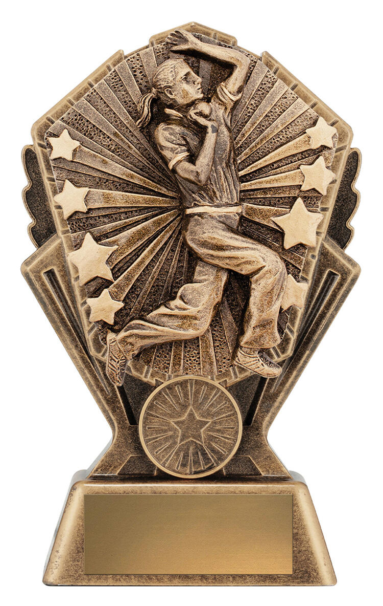 This striking trophy presents a female cricket bowler captured in dynamic motion, framed by an elegant starburst design. Crafted in radiant gold tones with a metallic finish, its contemporary style is balanced by a circular base and a distinguished star emblem. A standout choice for recognising excellence in cricket, it sets the benchmark for cricket trophies that truly celebrate the spirit of the game.
