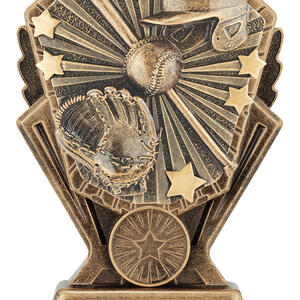 This baseball trophy features a striking fan shaped top in gold, crafted with attention to both form and detail. The design showcases a baseball, glove, bat, and helmet, all accented by star motifs that lend a sense of occasion. Durable resin material and elegant finishes create a memorable recognition piece for celebrating achievement in baseball.