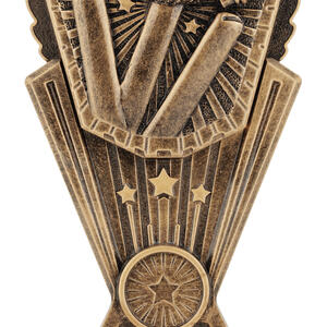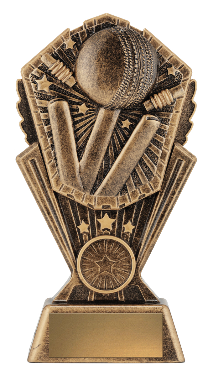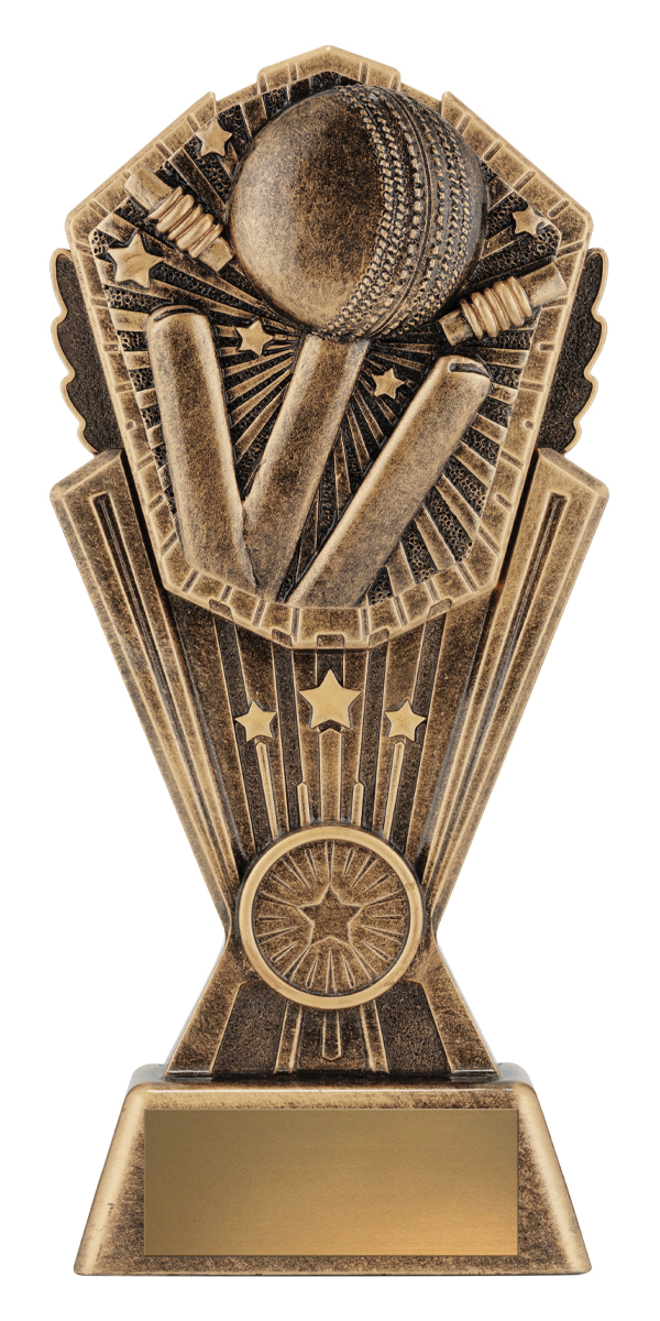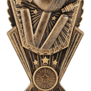 Showcasing cricket's defining moments, this trophy features a striking gold metallic finish with detailed cricket elements, including a ball, stumps, and bails. Its trophy like silhouette and rectangular base create a timeless design, ideal for recognising achievement in cricket. An excellent choice for those seeking quality cricket trophies that leave a memorable impression.