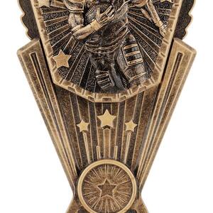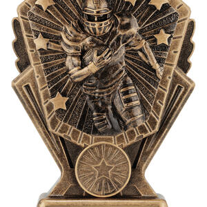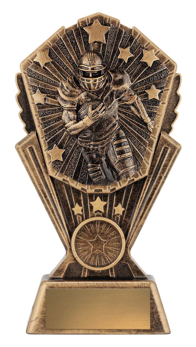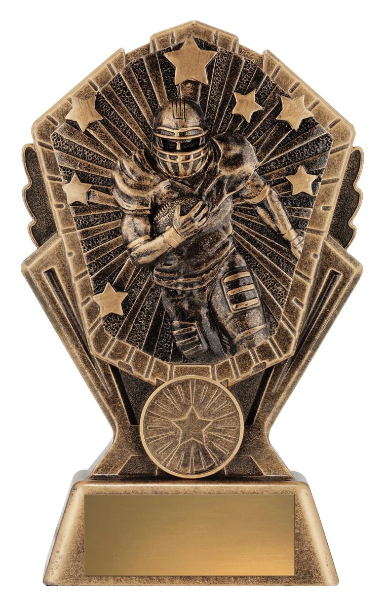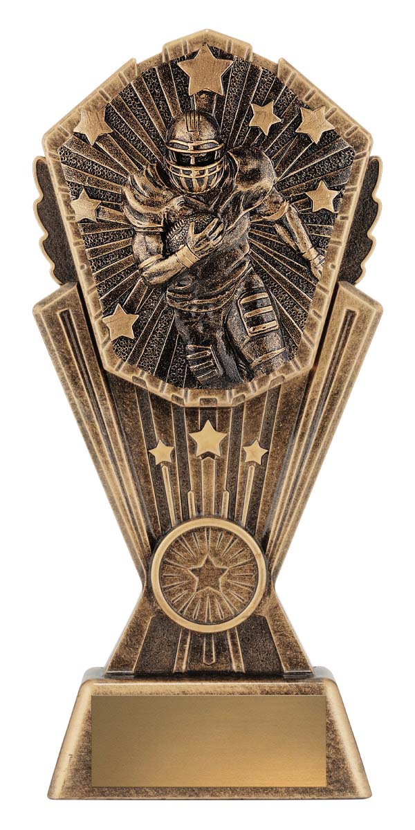 This striking resin trophy features a male figure, surrounded by radiating stars. The antique gold finish and detailed wave pattern make it a standout piece for american football presentations.