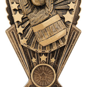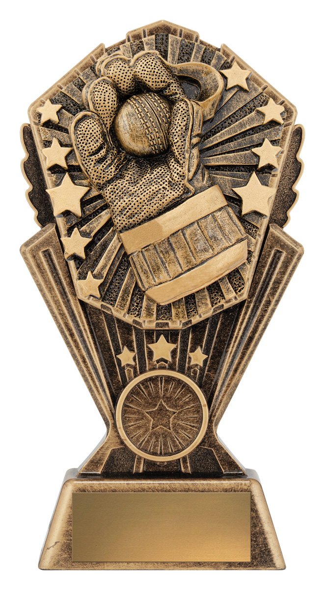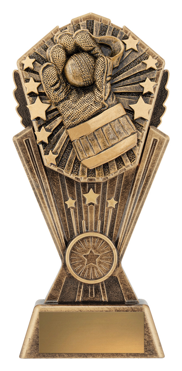 This elegantly crafted cricket trophy features a striking hand holding a cricket ball, encircled by stars for a celebratory effect. Cast in rich gold tones with a metallic finish, its decorative base enhances the sense of achievement. A standout option in cricket trophies, it offers a memorable and enduring symbol of recognition for excellence on the field.