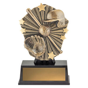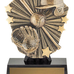 High gloss black plaque featuring an antique gold baseball and softball motif with bat, glove, helmet, and stars. The smooth surface finish provides a premium look perfect for club awards, presentation nights, or special recognitions.