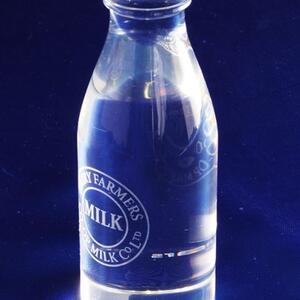 Unique crystal award in the shape of a milk bottle with precision engraved logo detailing.