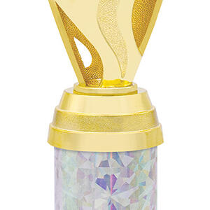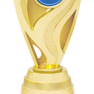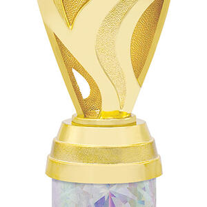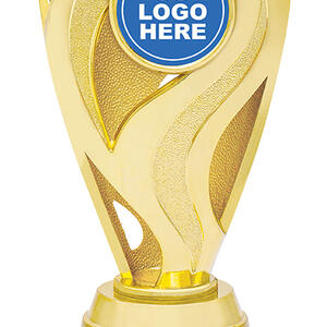 This sports trophy cup combines a striking flame inspired silhouette with an elegant palette of gold, black, and iridescent accents. Crafted from durable plastic and set on a refined marble base, itÂ’s designed to make every achievement memorable. The circular centre accommodates your custom logo, while the rectangular plaque provides space for personalisation, making this award a lasting symbol of recognition.