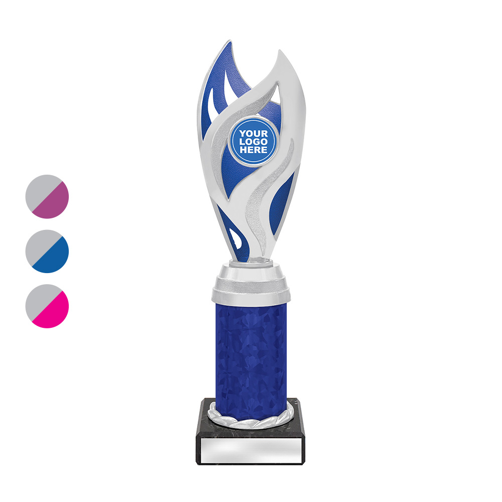 This flame inspired trophy stands out with elegant silver, pink, blue, or purple tones and a contemporary profile. Crafted from durable plastic, it is finished with a sleek black marble base for a modern touch. The spacious, customisable logo area ensures this is an ideal choice for recognisable achievement across general sports, making it a trusted option for those seeking affordale trophies.