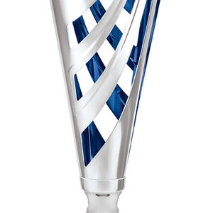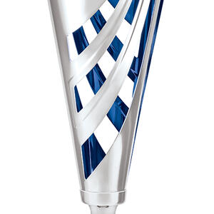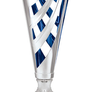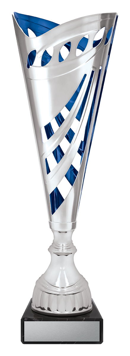This striking metal trophy cup showcases a sleek cylindrical form with a flared top, reflecting a modern sensibility. Distinctive cut out patterns and a polished silver, blue, and black palette create a memorable visual impact. Constructed from metal, plastic, and marble, it offers a refined, durable solution for acknowledging achievement across any event or occasion.
