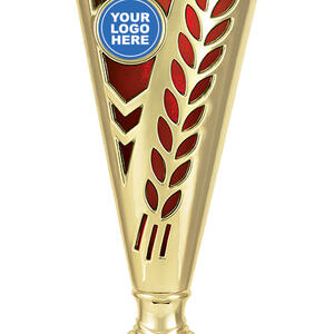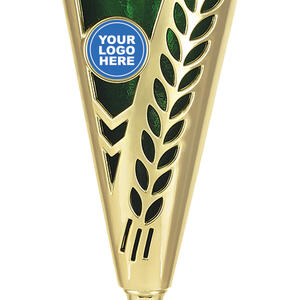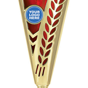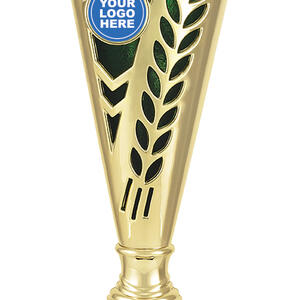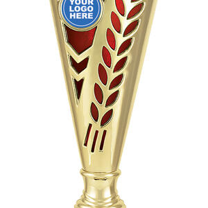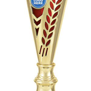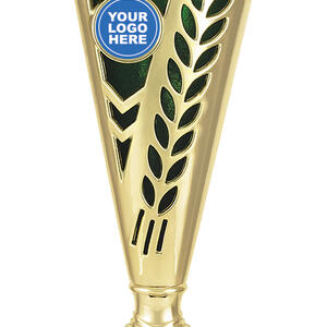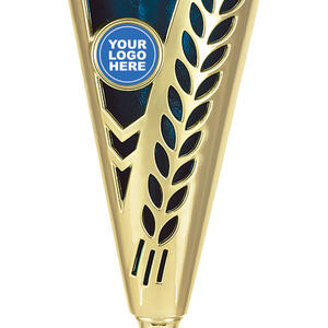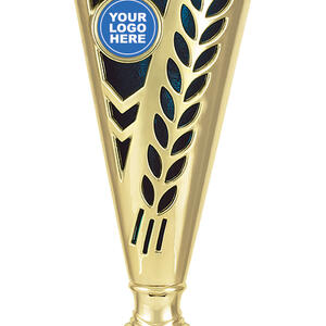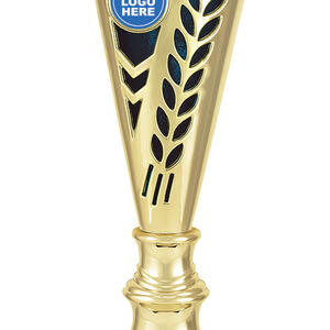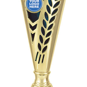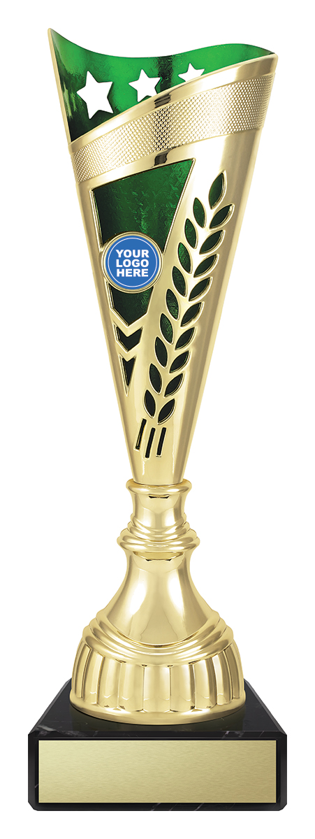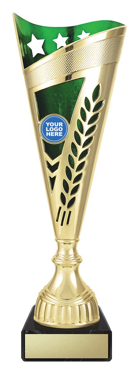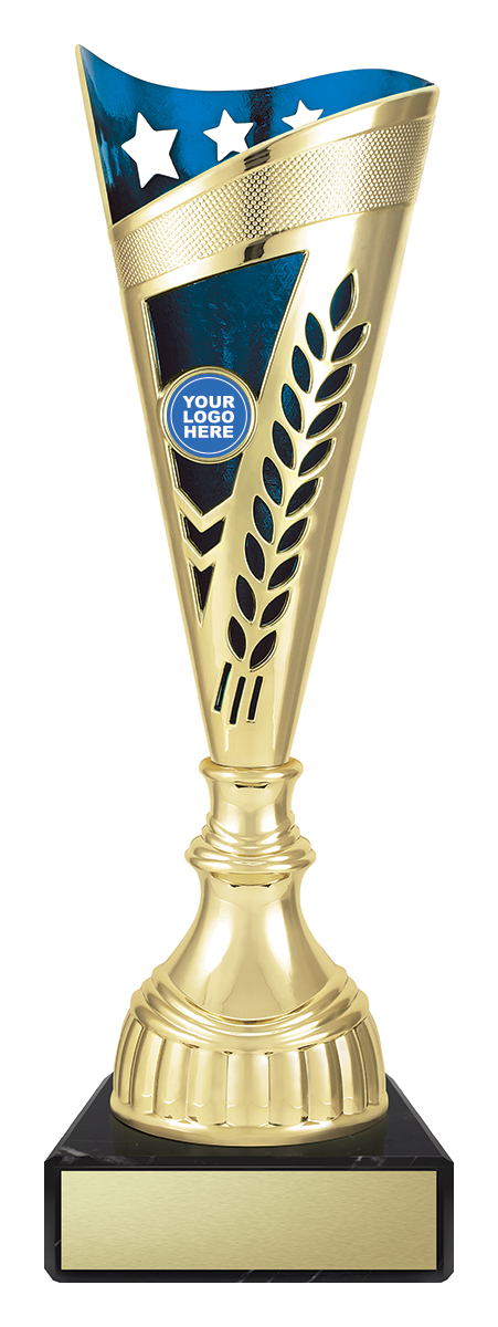 This plastic trophy cup features a tall, conical silhouette highlighted by a radiant gold finish with blue, green, or red accents. Decorative laurel details and star cutouts create a sense of achievement, while the customisable logo area provides a professional touch. Crafted from plastic and marble, it is a durable and memorable choice for general sports recognition.